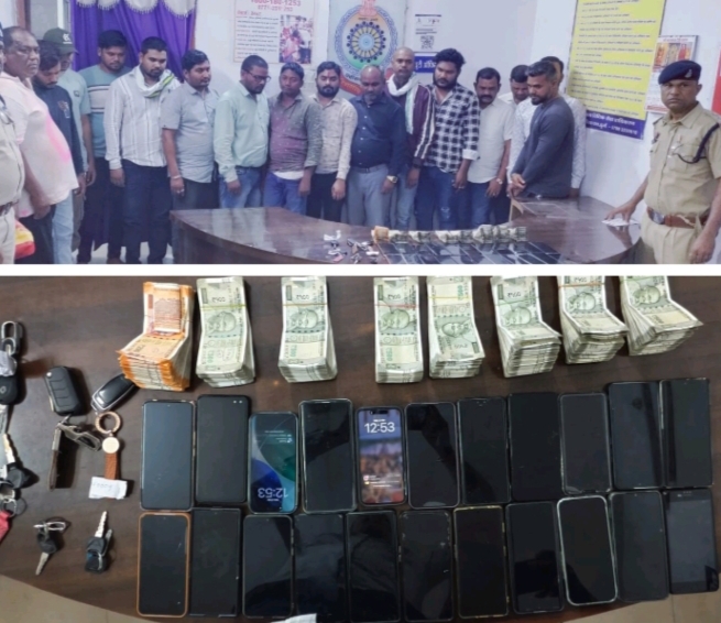 जप्त सामग्री : 1. नगद राशि ₹3,59,470/-, 2. 22 नग मोबाइल फोन, 3. 03 मोटरसाइकिल, 4. 03 चारपहिया वाहन।